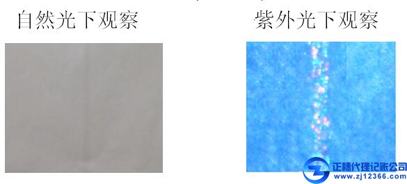 廣州記賬報(bào)稅公司發(fā)現(xiàn), 在發(fā)票的發(fā)票聯(lián)、抵扣聯(lián)和記賬聯(lián)專用紙張中含有造紙防偽線,防偽線在自然光下有黑水印的特點(diǎn),在365nm紫外光照射下,為紅藍(lán)熒光點(diǎn)形成的條狀熒光帶(如下圖所示),防偽線據(jù)票面右邊緣20mm-80mm。